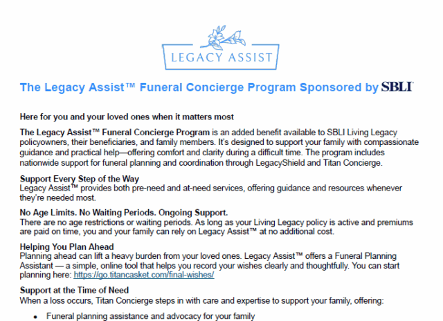 The Legacy Assist™ Funeral Concierge Program is an added benefit available to SBLI Living Legacy policyholders. It’s designed to support your clients’ family with guidance and practical help during a difficult time. The program includes nationwide support for funeral planning and coordination through LegacyShield and Titan Concierge. When a loss occurs, Titan Concierge steps in by offering: